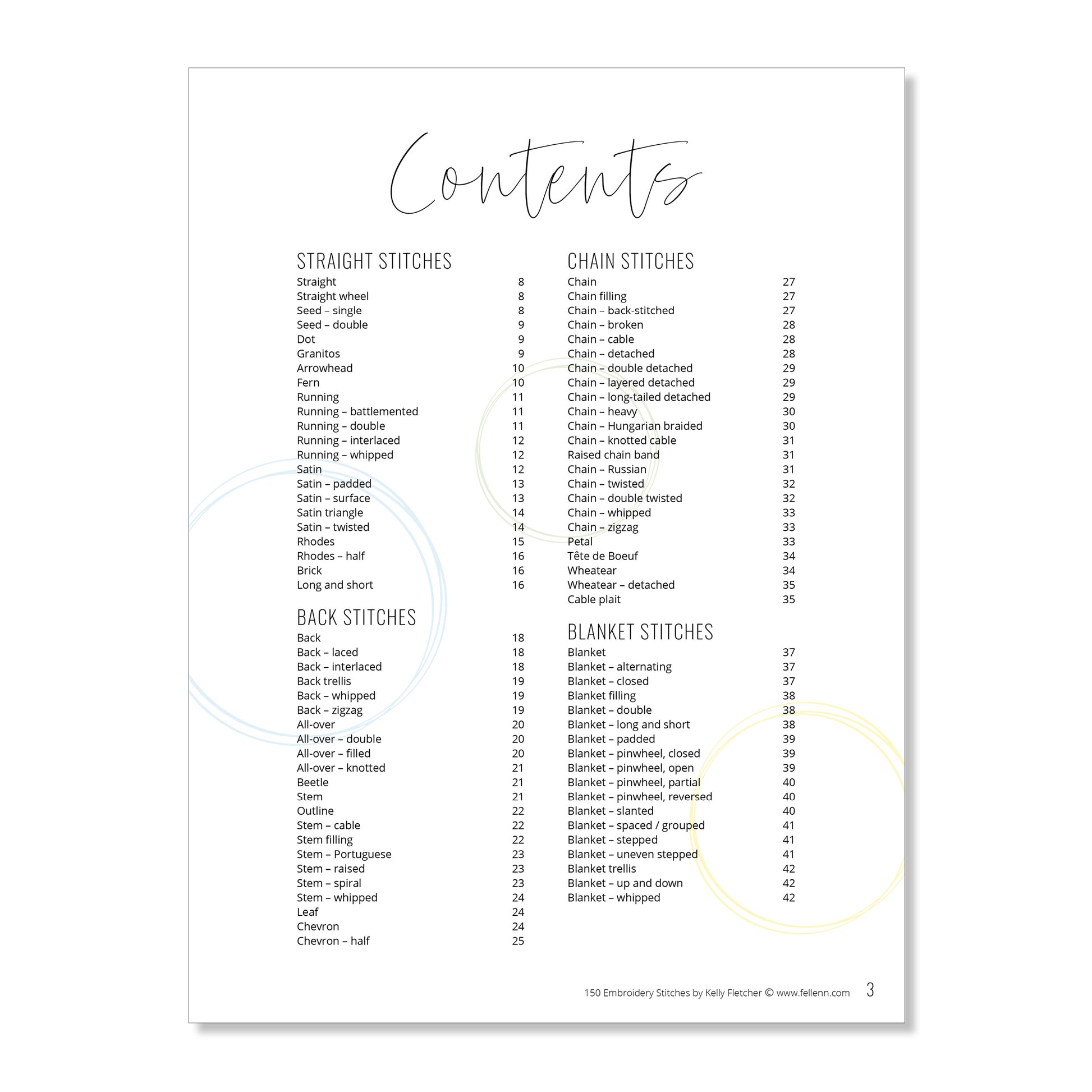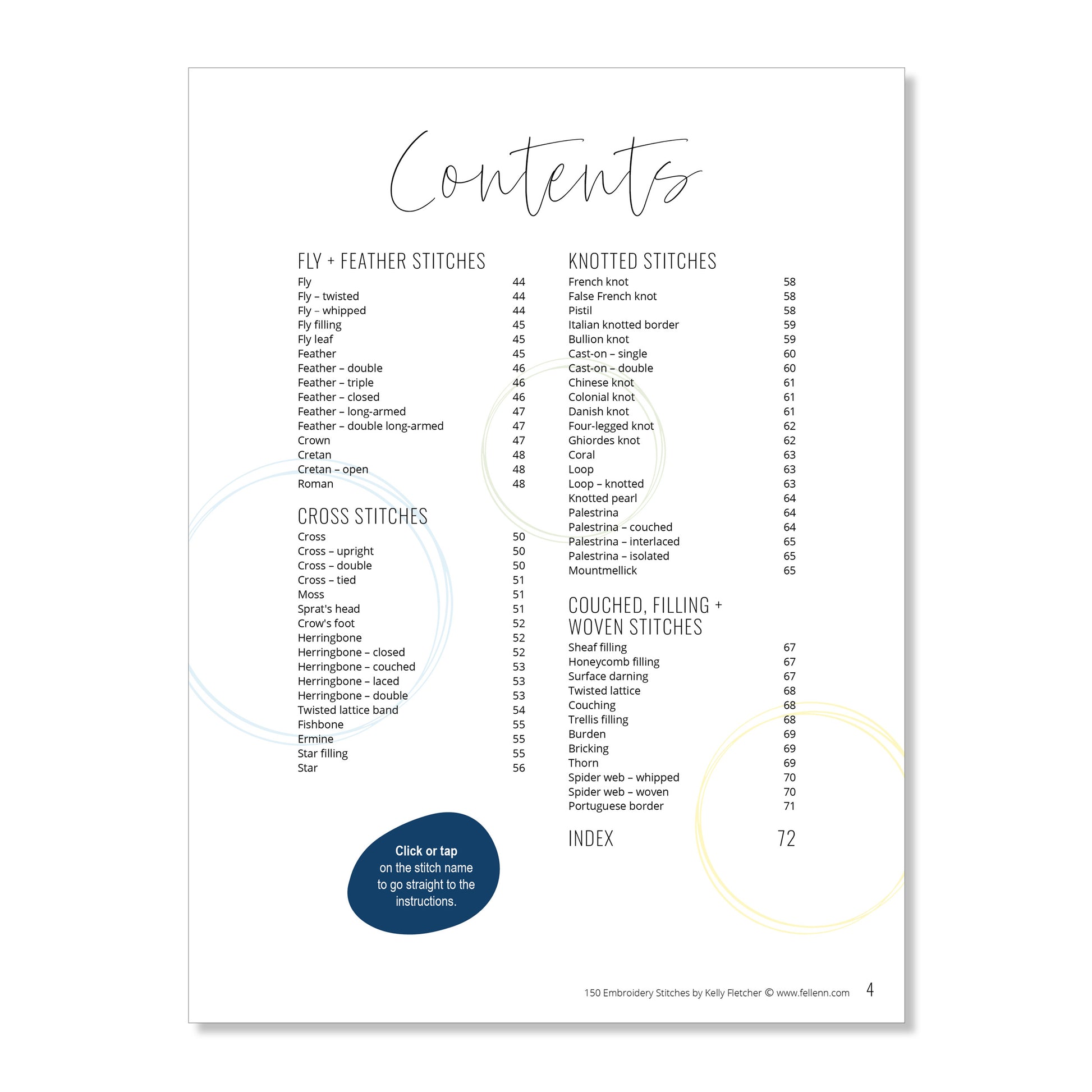 150 stitches for you to explore. Well-known basics as well as some unusual ones and variations on stitches you may already know. Divided into eight stitch families – straight, back, chain, blanket, fly and feather, knotted, crossed and couched, filled and woven – you can see how they relate to and build on each other. The clickable contents page and an index at the back make it easy to find any stitch and alternative names are listed for each one, too. With a full-colour photo as well to show how the stitches in each family look on fabric, 150 Embroidery Stitches is a great addition to your stitch library.