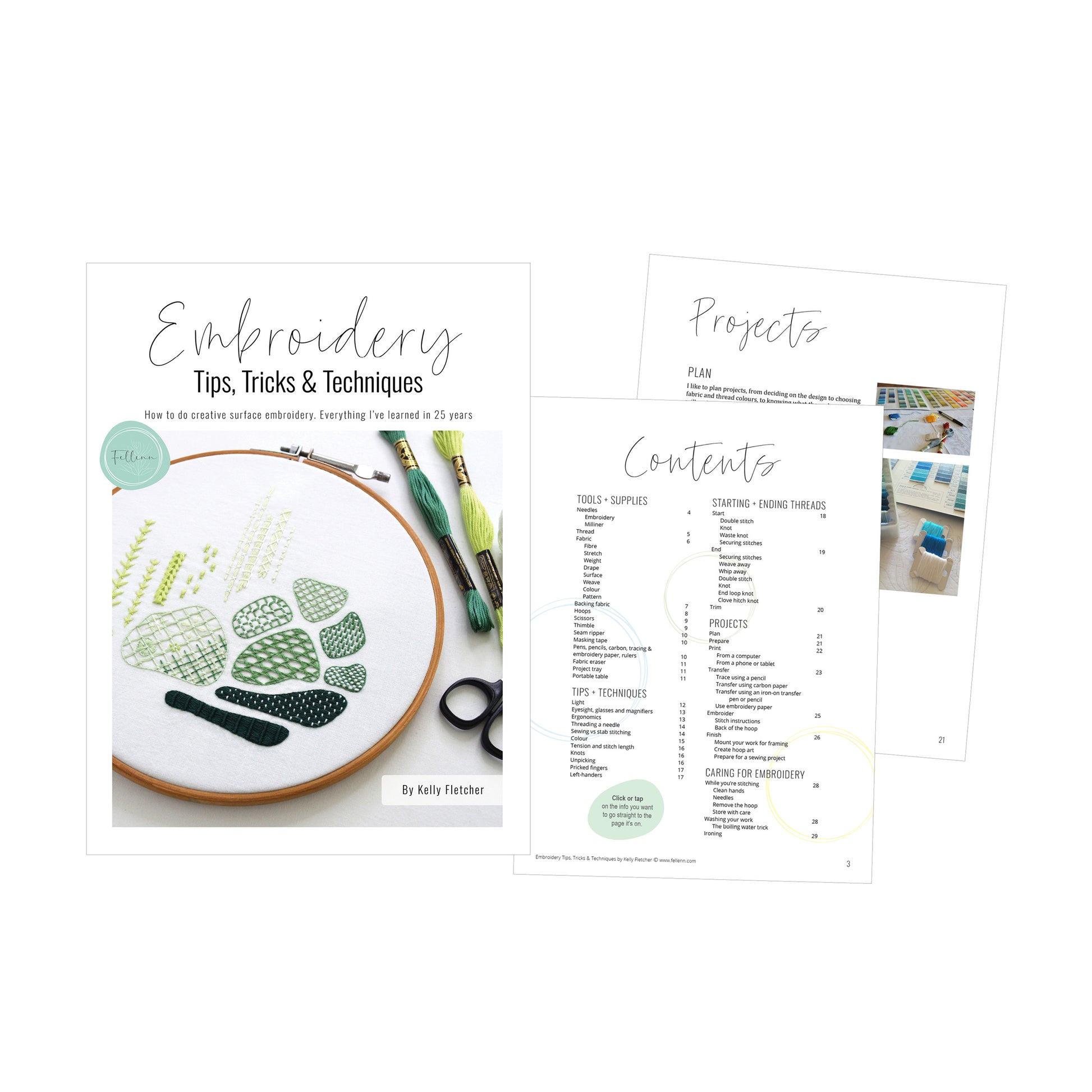 The books come in PDF format. You can save and read them on your computer, tablet or phone, great for embroidering on the go and zooming in on the illustrations and photos. As well as the clickable navigation, just tap to go to the page you want. If you prefer paper books, they’re high-quality files that fit on A4 and US-letter sized paper. Easy to print at home or a copy shop. So there are options for all, whatever makes you comfortable.