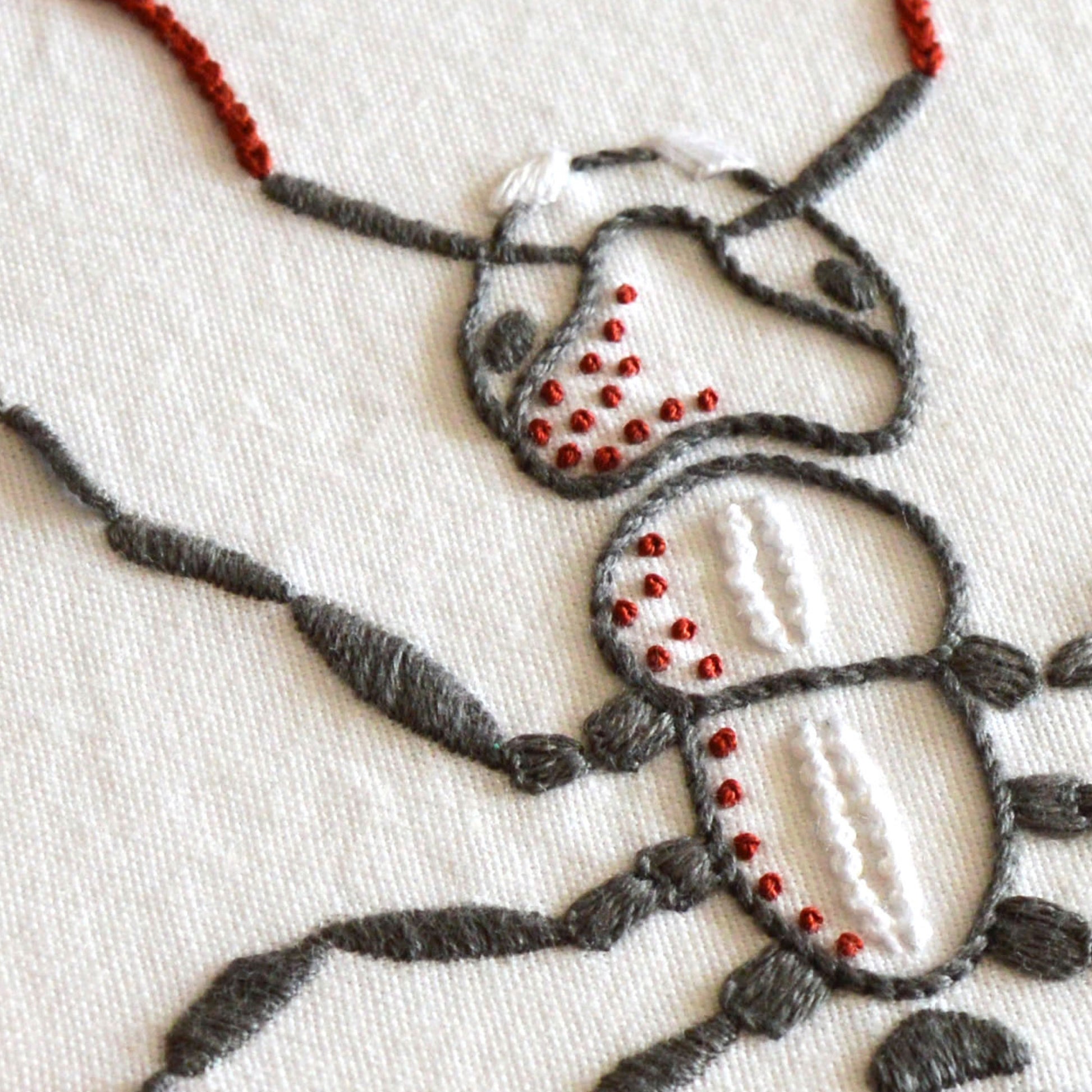 Did you know there are nine segments in an ant’s leg? Plus two claws? Each of which are made up of five different stitches in this pattern. You’ll certainly get your enjoyment’s worth out of embroidering this one.