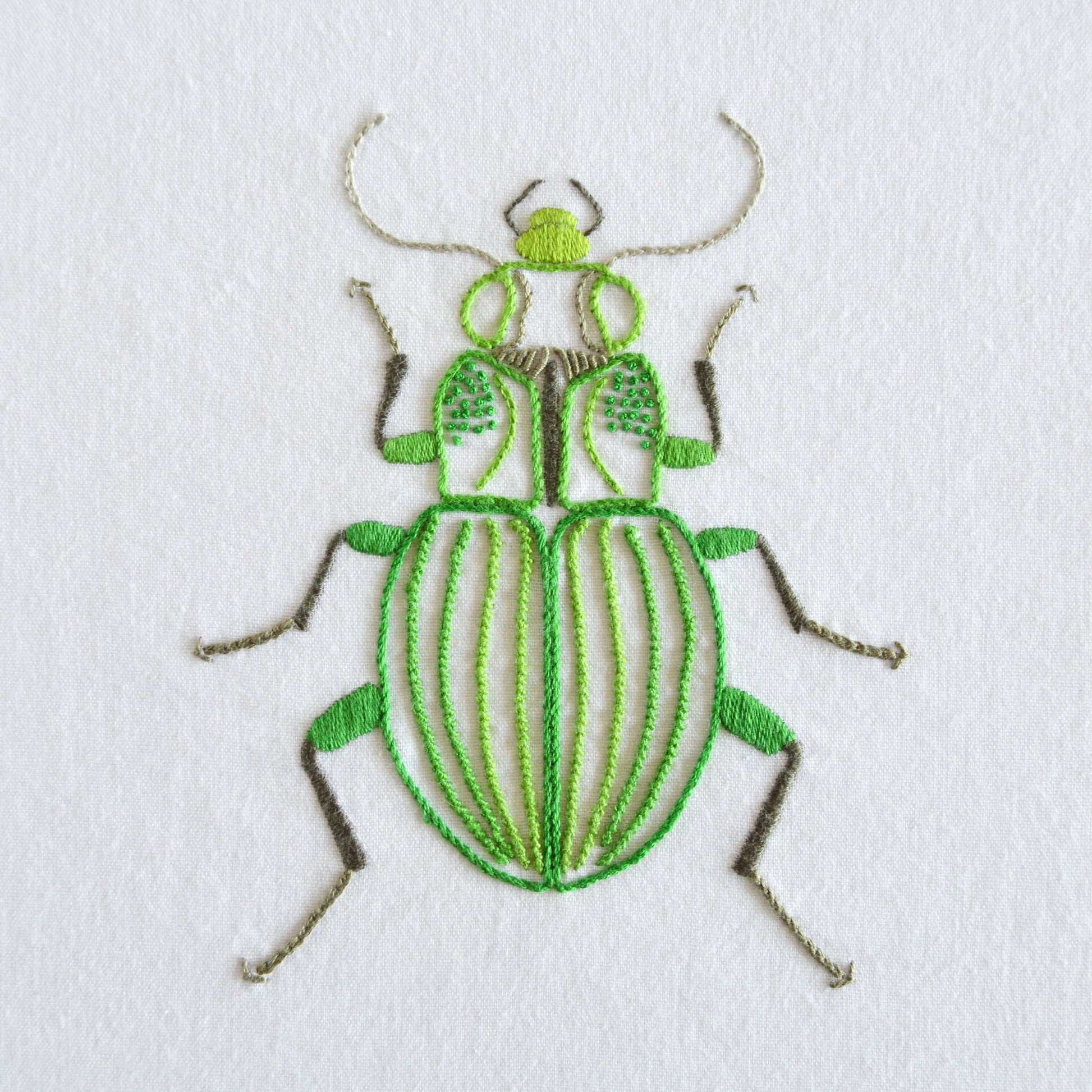 This gorgeous beetle is fun and satisfying to embroider. There are enough different stitches in it to learn some new ones without feeling overwhelmed. And you can easily change the colours. It’s full of little details – like using a knobbly stitch to create texture on the carapace – and is suitable for all skill levels.
