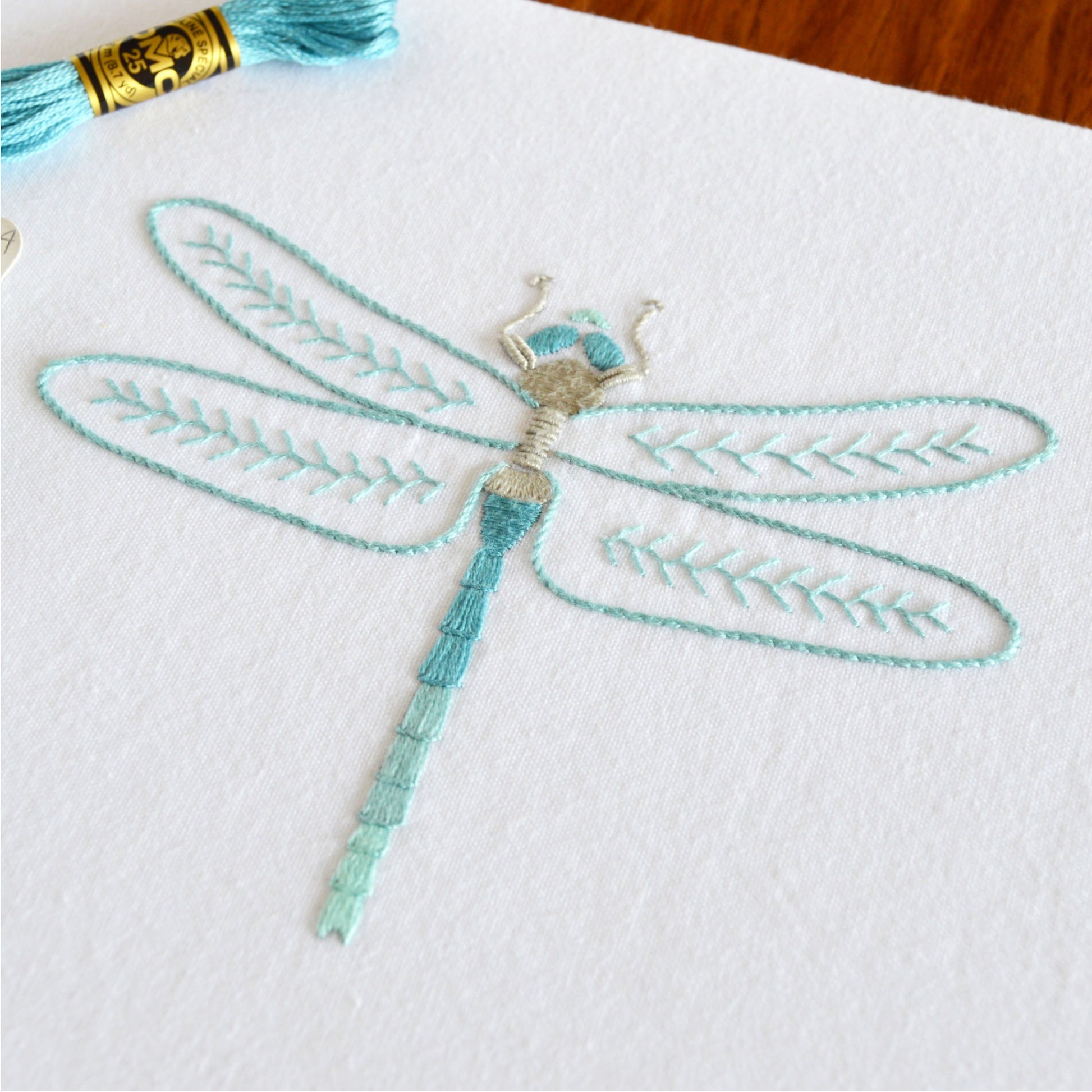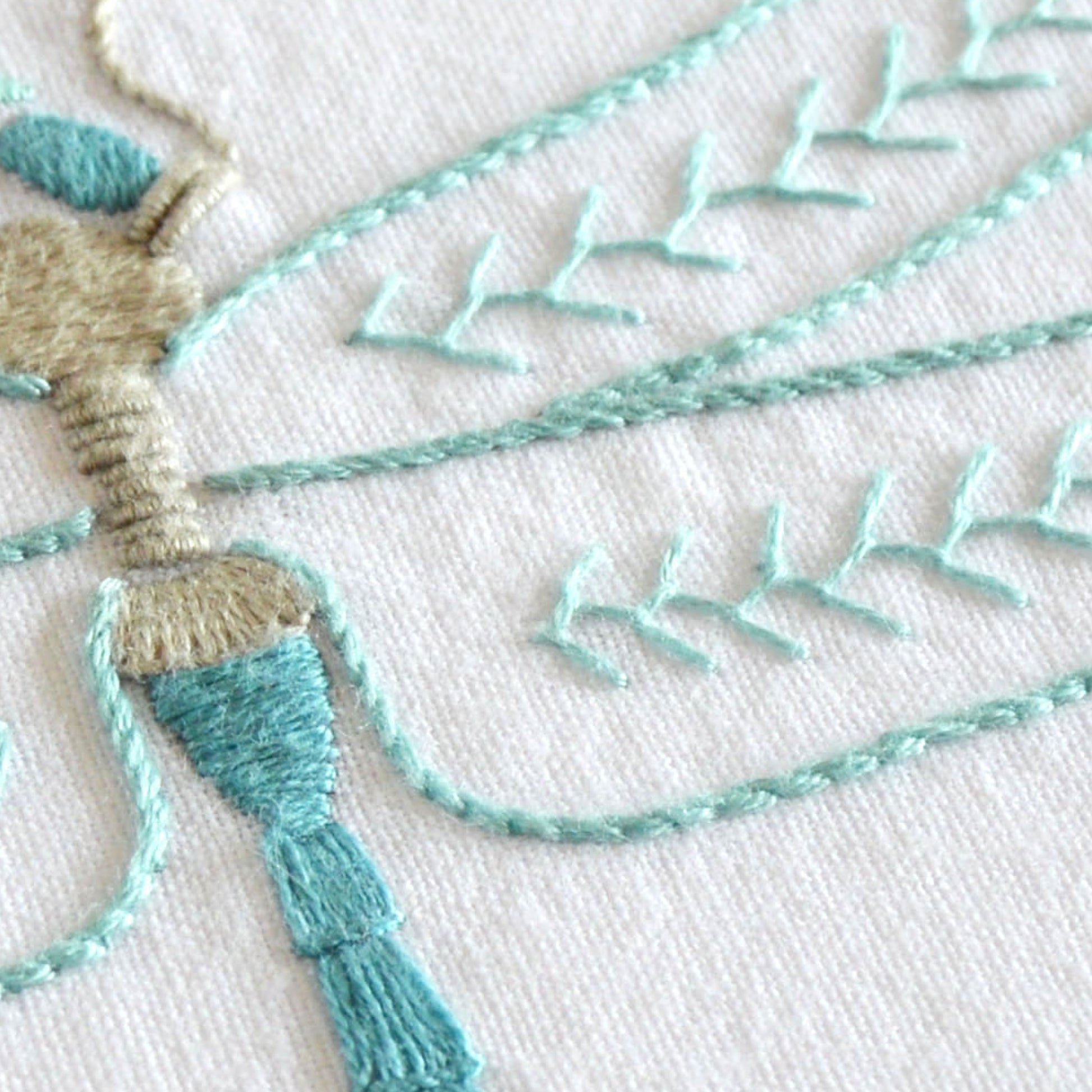 Some interesting ways of using stitches to create this realistic dragonfly, stacking and laying them alongside each other. It’s fun and really satisfying to embroider. And brings to mind lazy summer days, skimming over ponds in the country, no?