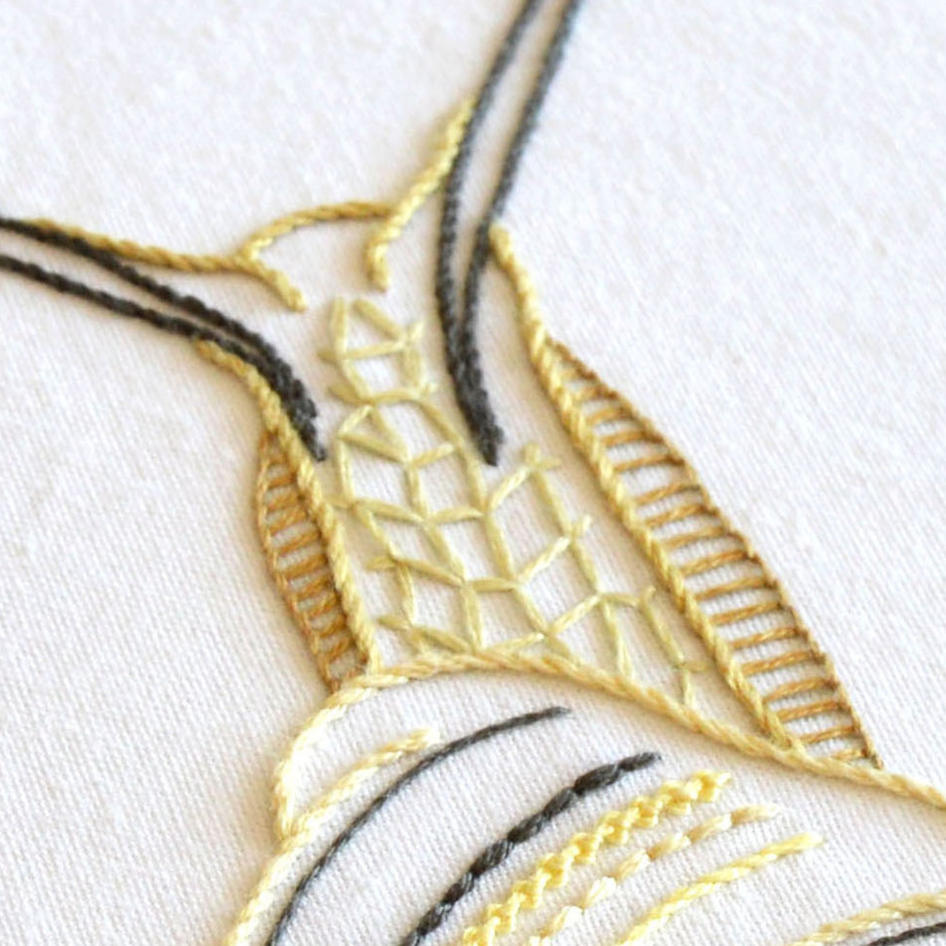 The swirls on that shell are just happiness with a needle and thread. All the different stitches create texture and interest, without affecting the clean lines of the design. So satisfying to embroider. A perfect match between stitch and skin is the cherry on top.