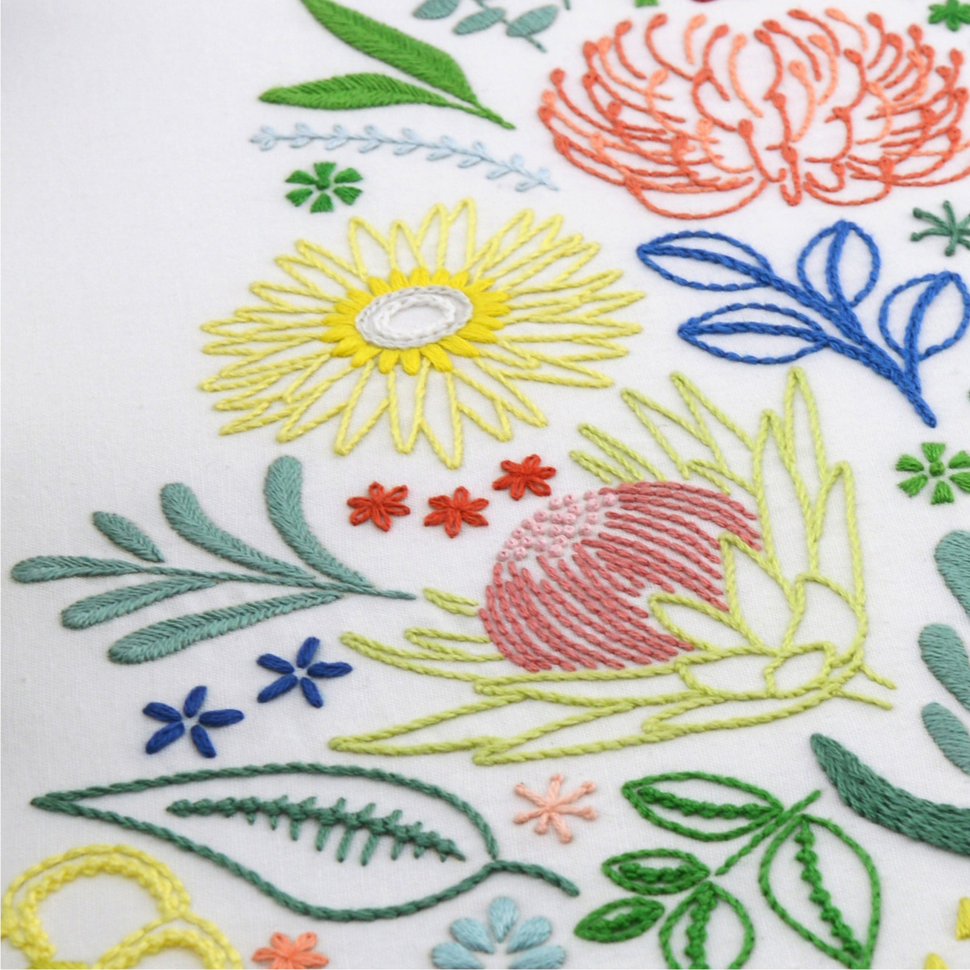 The holidays are hot and sunny in the southern hemisphere, with blue skies and nature in full bloom. This summer tree represents that. It’s full of sprigs and leaves and flowers embroidered in vibrant colours. And uses a bunch of great stitches to bring them to life. It’s a fresh, summery take on a traditional Christmas tree that you’re sure to enjoy embroidering.
