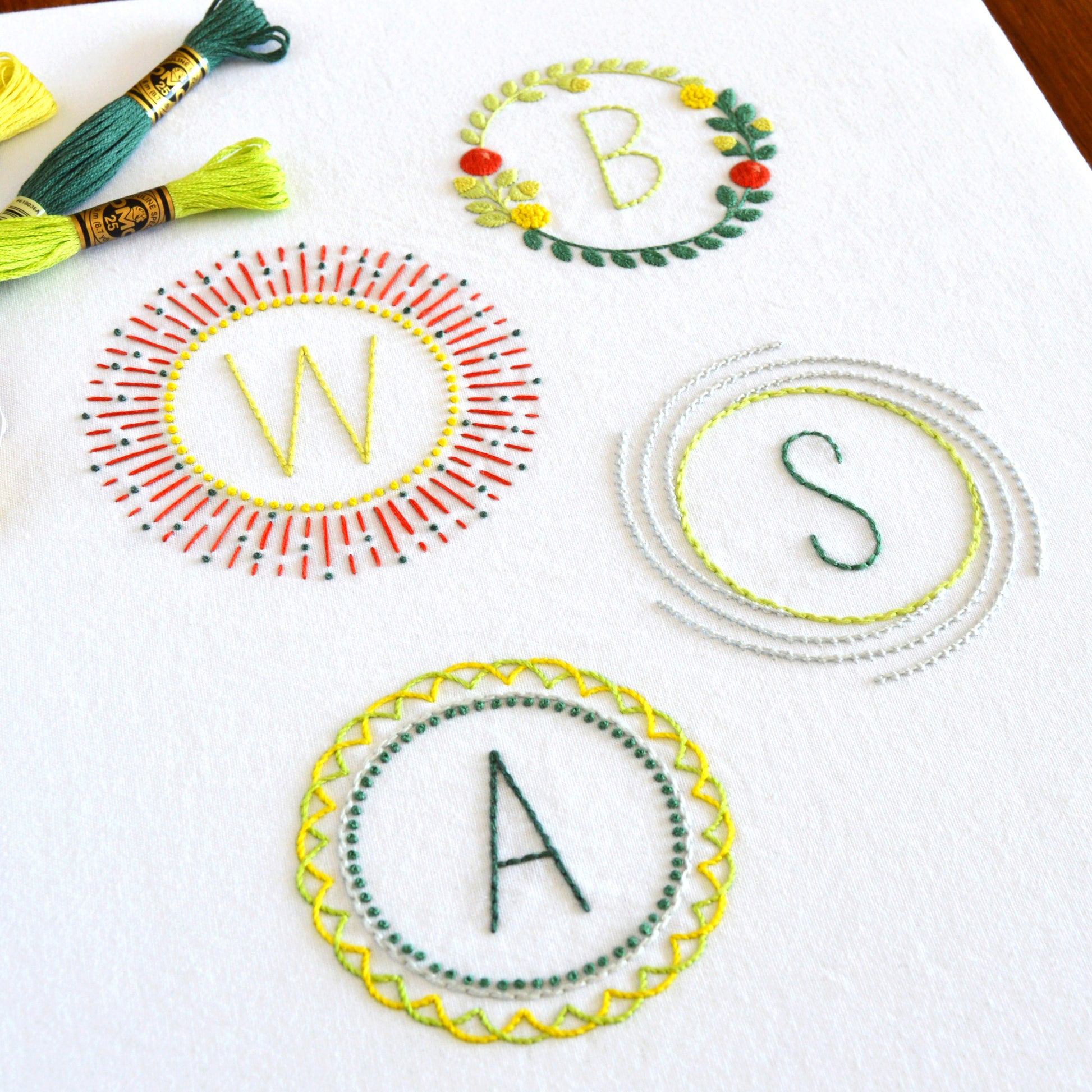 The letters in these monograms are the same, but with four completely different decorative elements. It’s a pattern you’ll use over and over again to personalise bags, clothing, throws, napkins… And there are some nice, easy techniques you may not have done before.