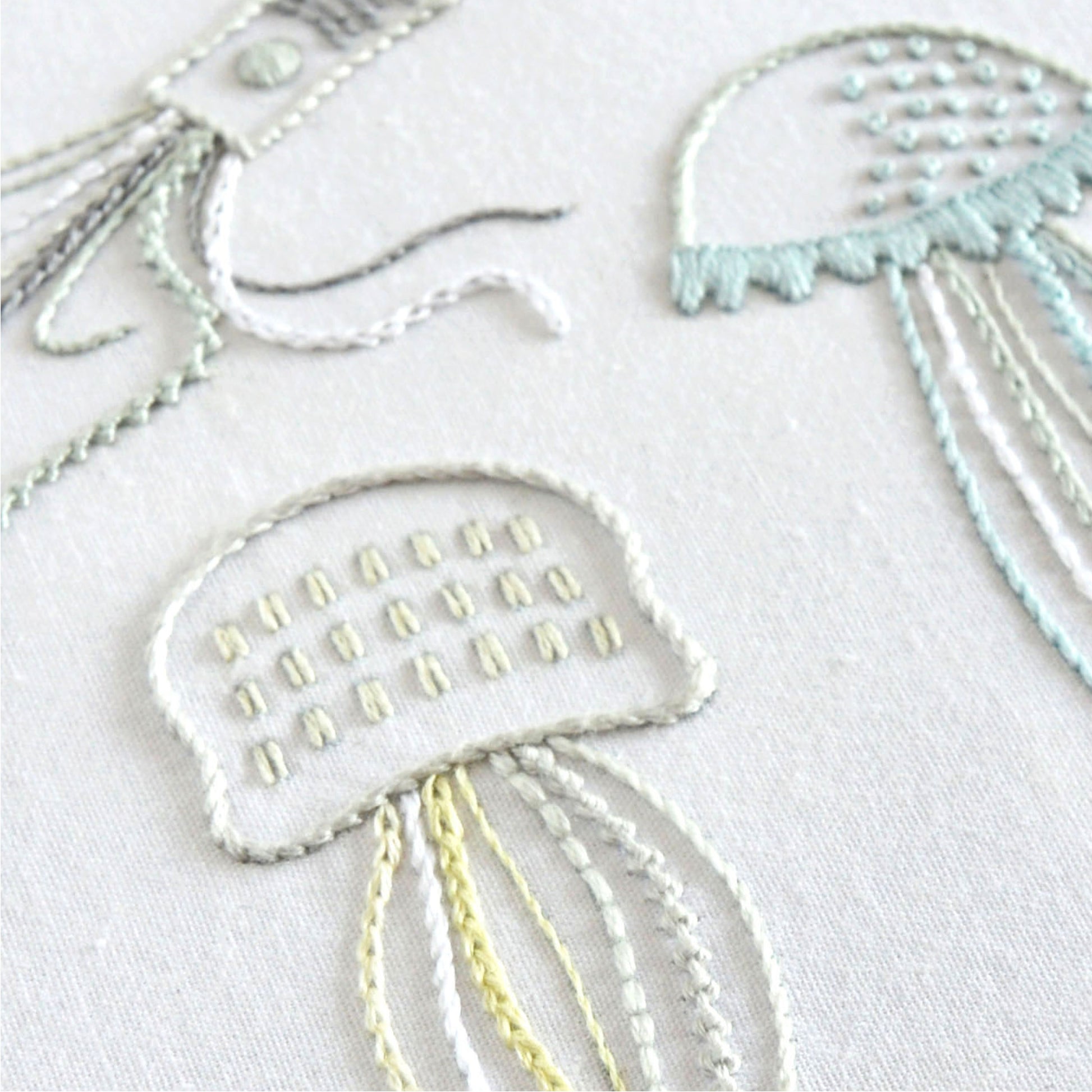 The tentacles are the star of this pattern, stitch-wise. Each is embroidered in a different stitch or thickness, creating texture and depth and movement. You can almost see these jellyfish drifting in an ocean current. They not only look great, but are also really satisfying to embroider.