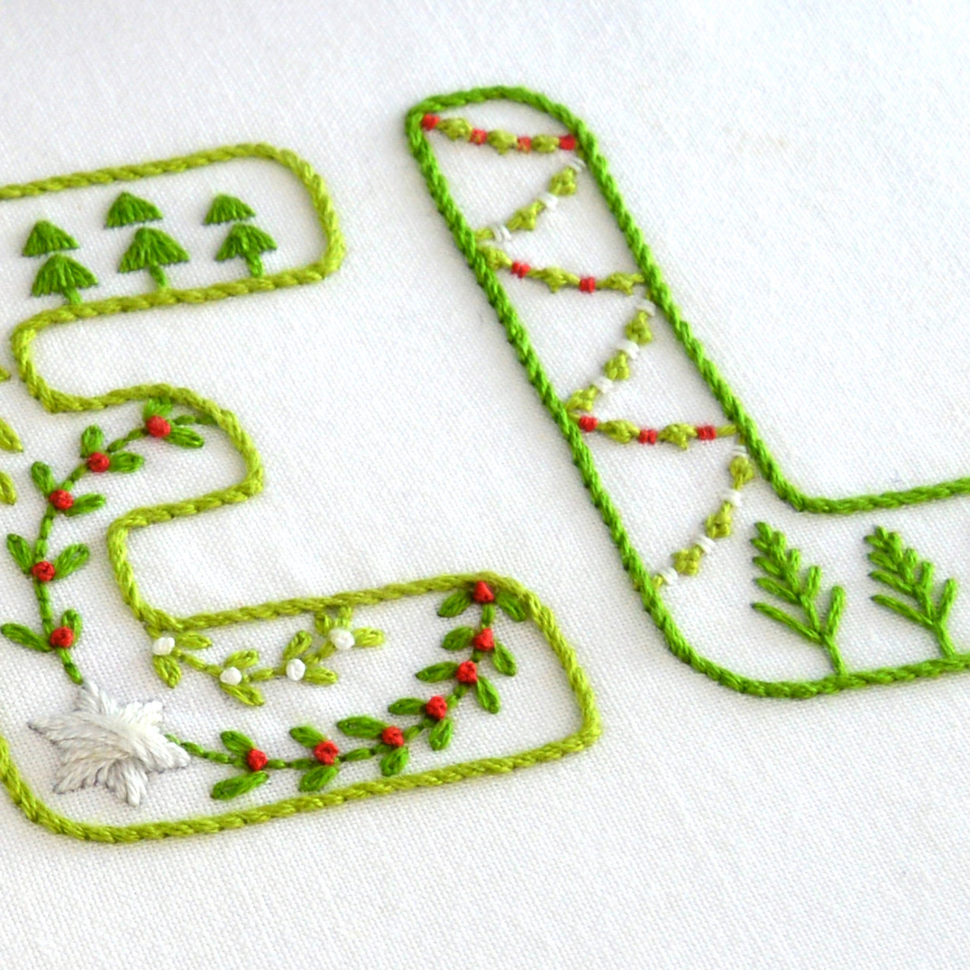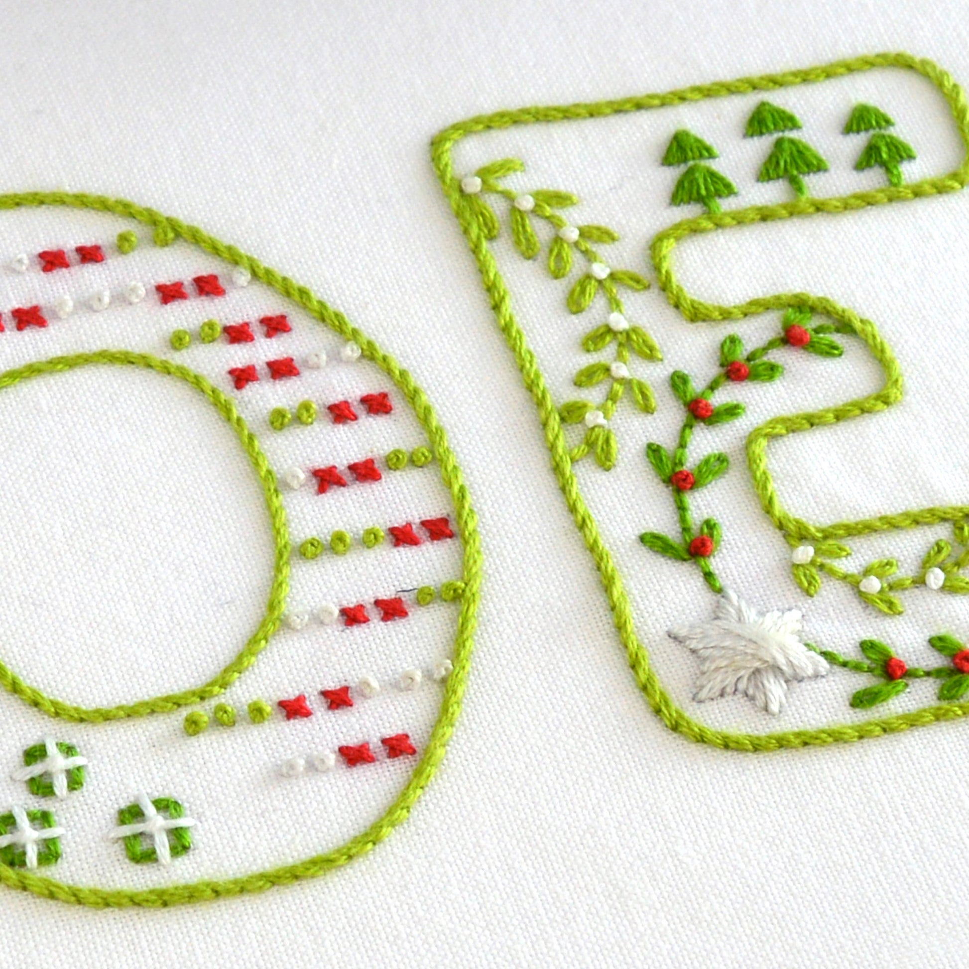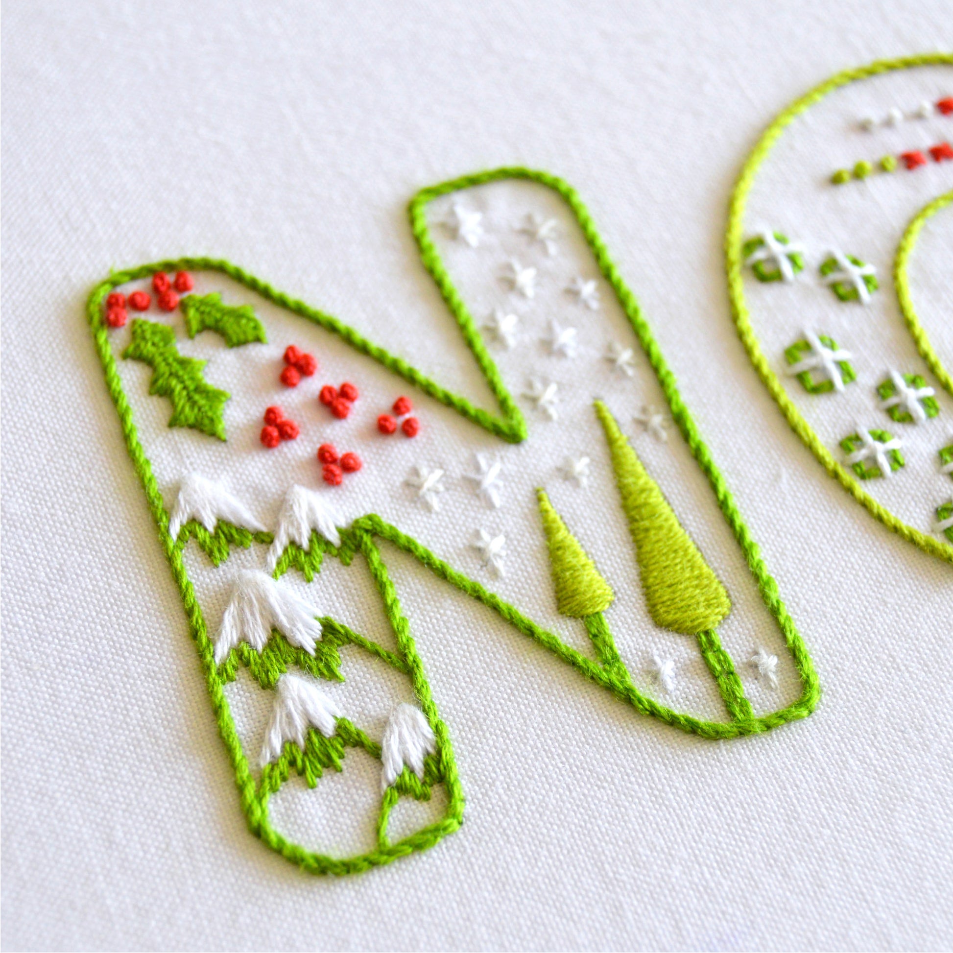 Trees and snow, gifts, garlands and wreaths. Each of the letters in this design is filled with holiday favourites. And embroidered in festive colours. All the different details make it fun and interesting to embroider. It’s a great way to get into the spirit of Christmas.