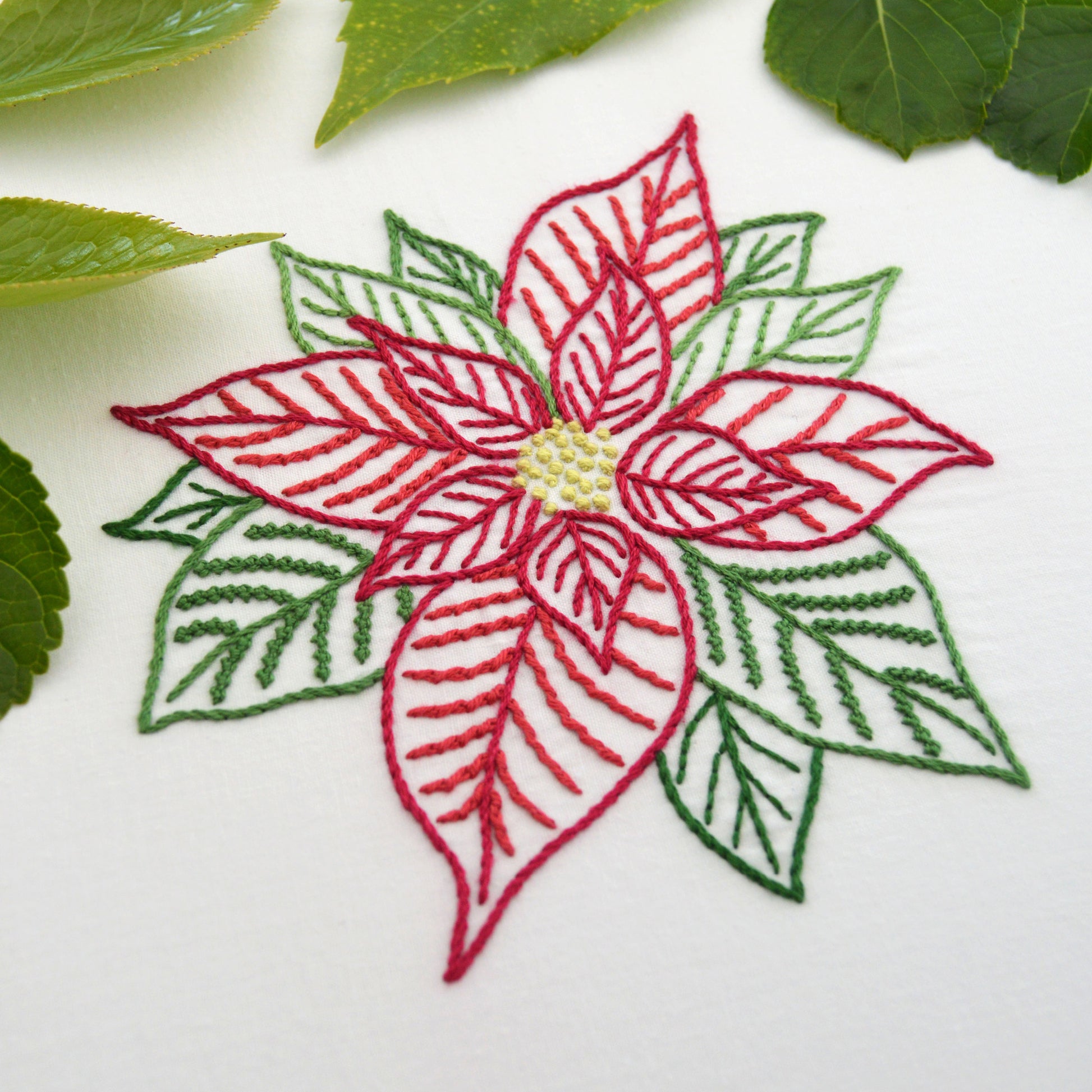 Rich reds and greens give this design a full-on Christmas feel. The leaves and bracts are embroidered in a variety of stitches, keeping it interesting to stitch as well as visually appealing. Lots of lovely texture and depth. It’s bold and bright and festive. And you’re going to love embroidering it for the holidays.