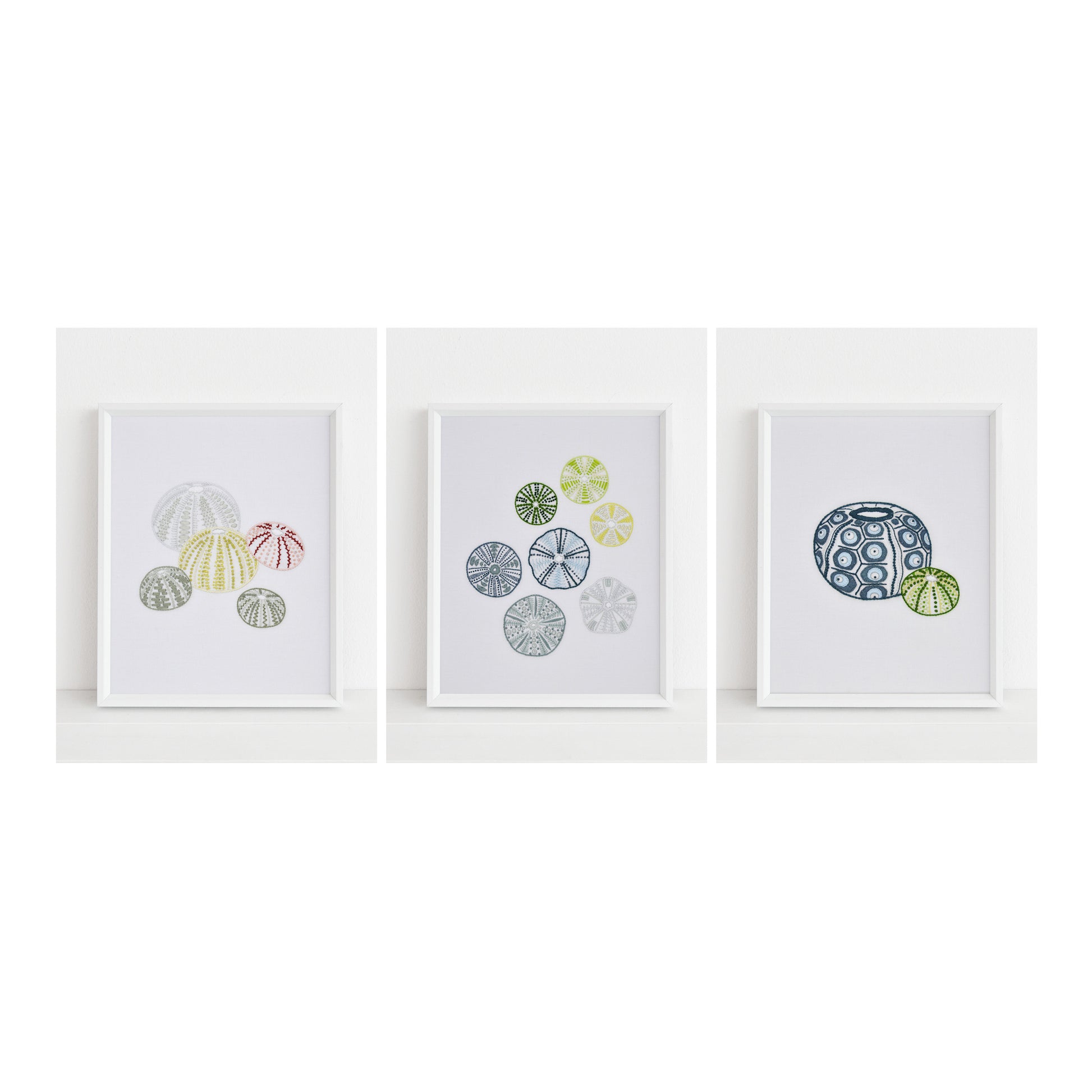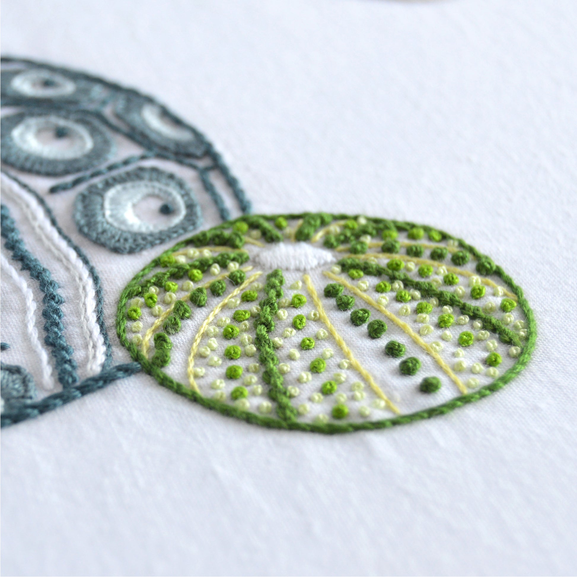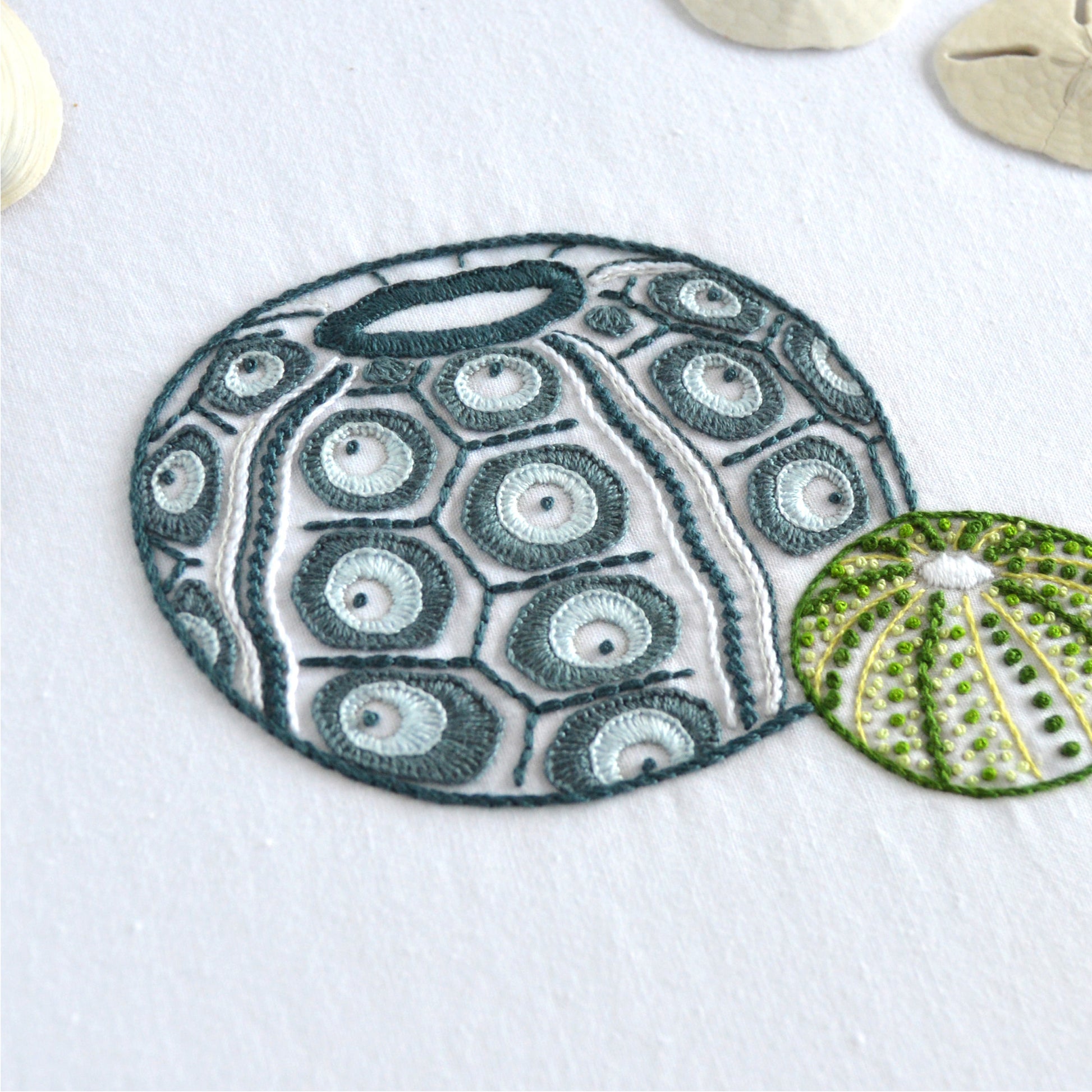 Once the protective shell of sea urchins, the circular tests they leave behind really lend themselves to embroidery. Their fivefold symmetry is super pleasing to our pattern-loving eyes. And the tiny holes and bumps where these small sea creature’s tube feet emerged and defensive spines attached translate beautifully into a variety of fantastic stitches.