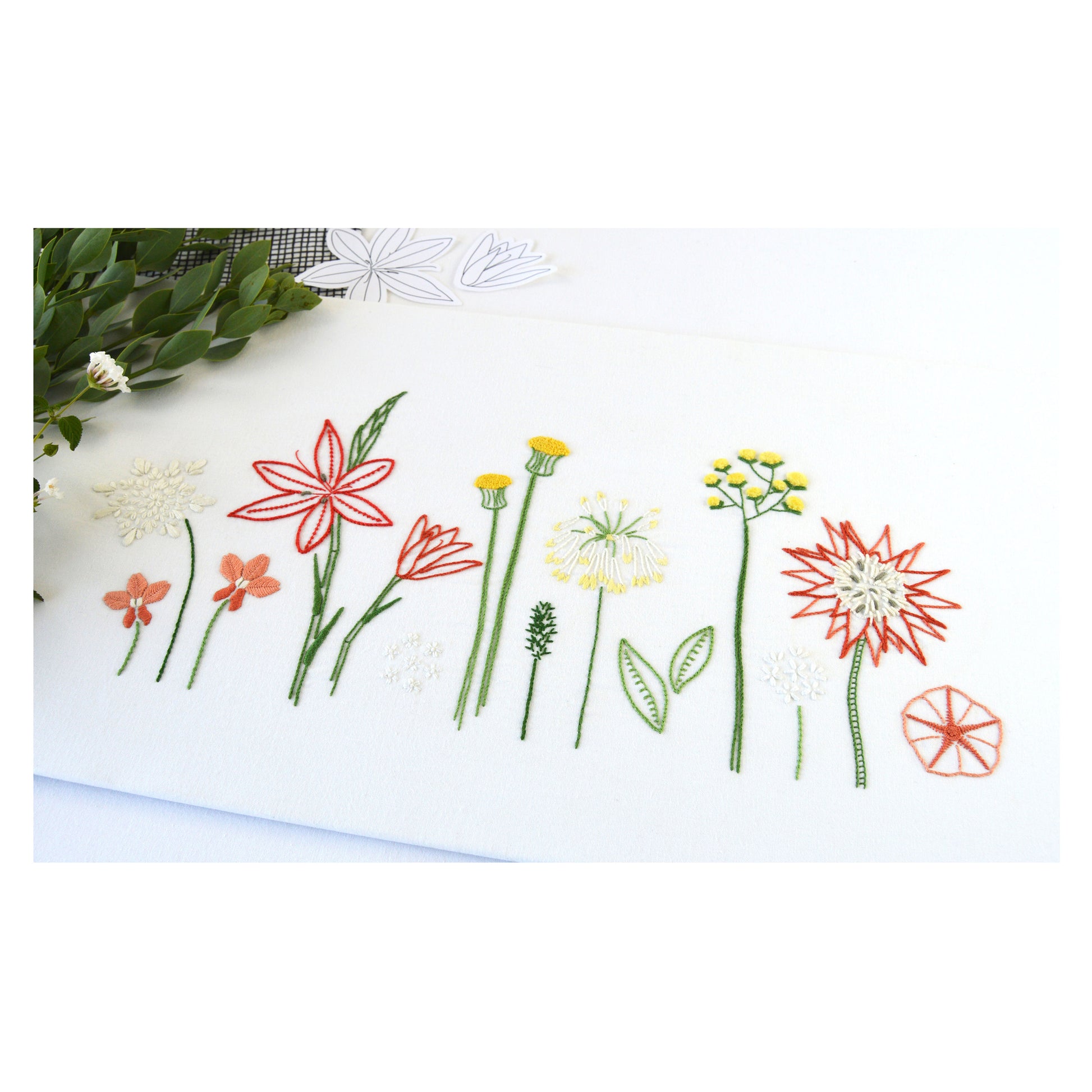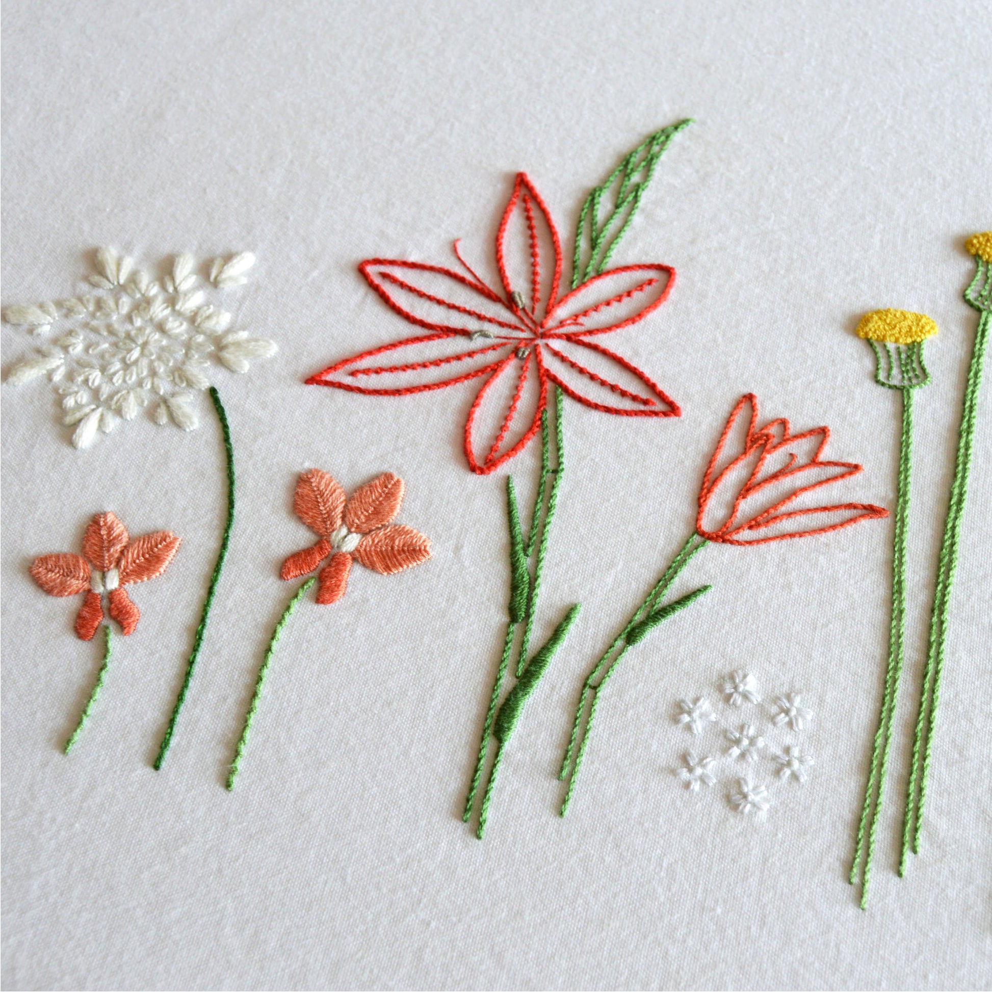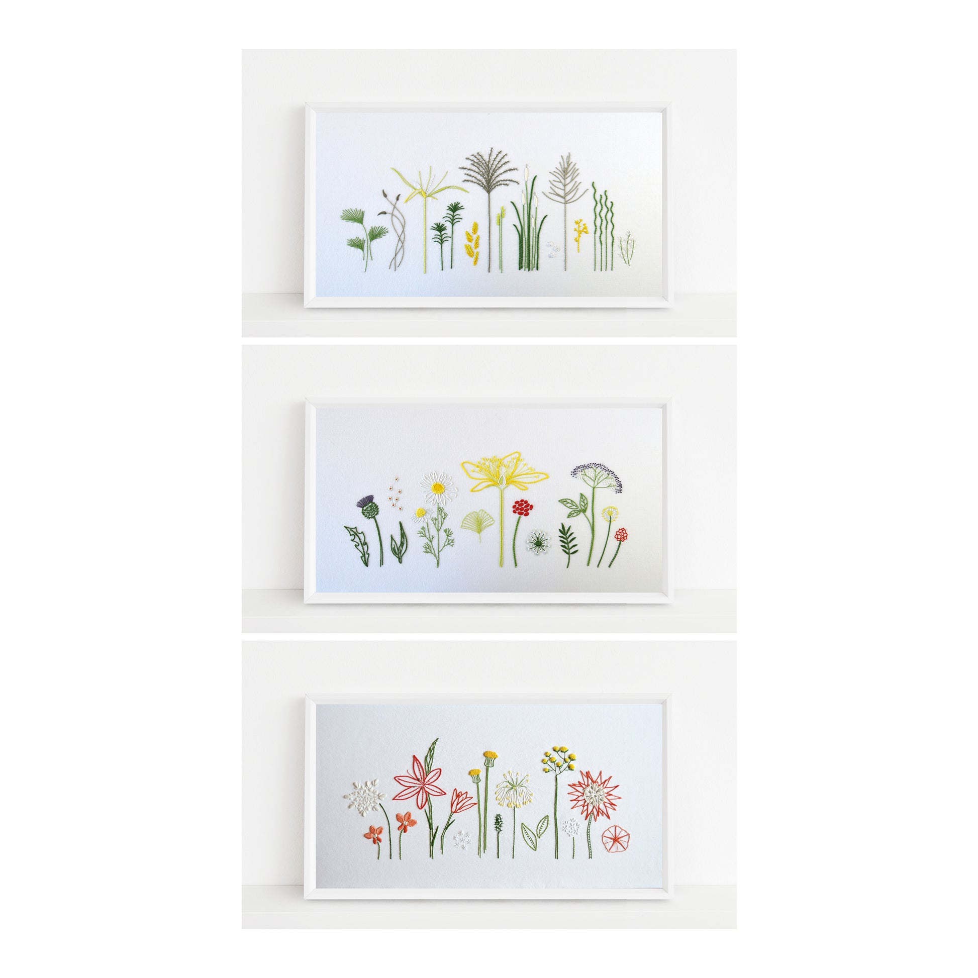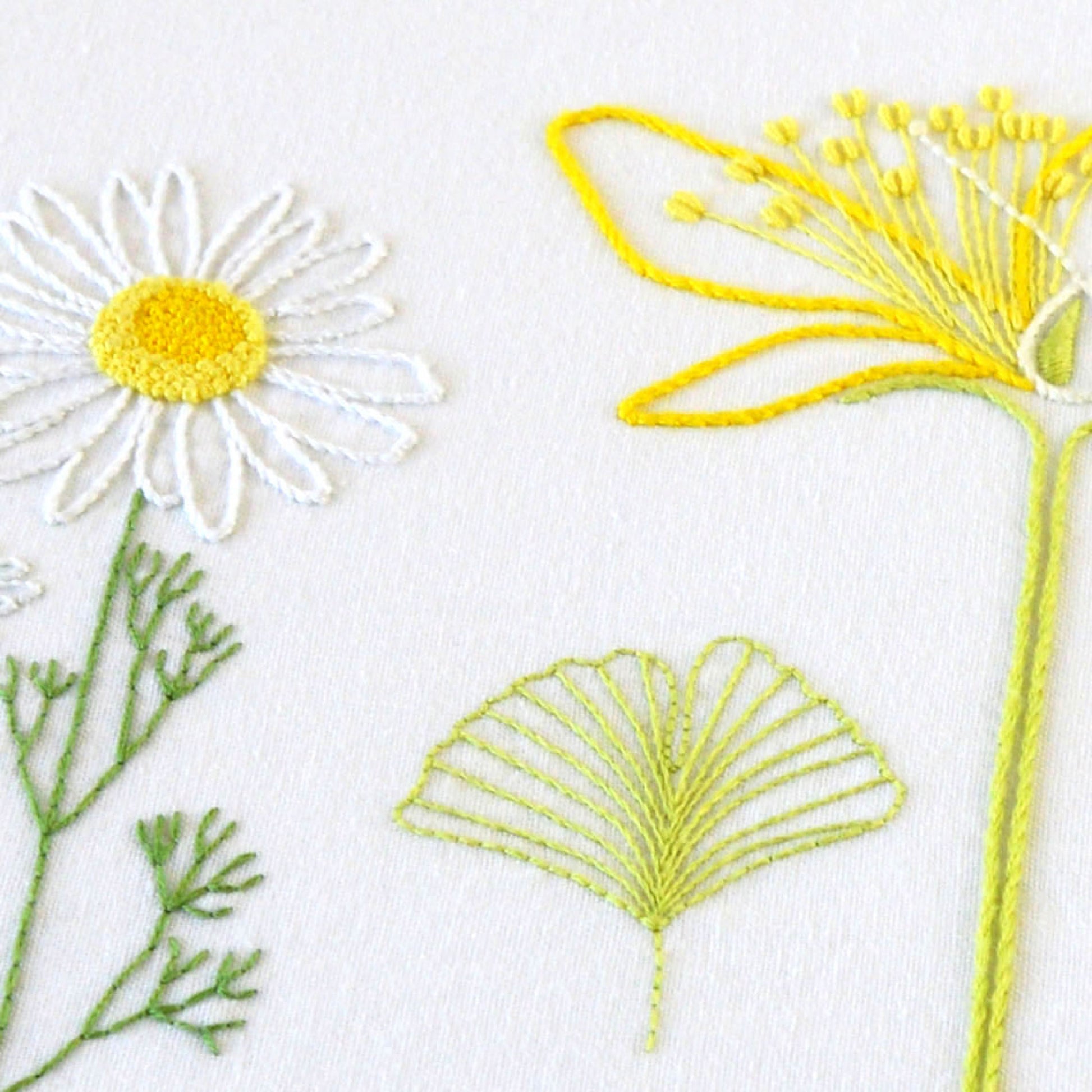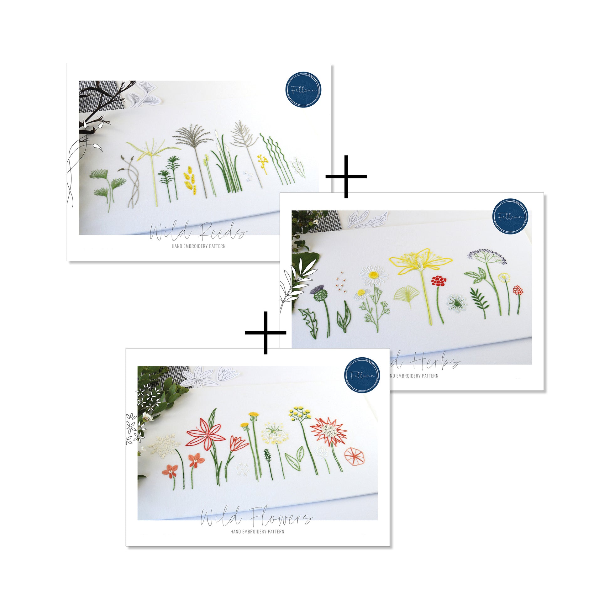 These patterns are inspired by the prairies and meadows of the countryside. And the wildflowers, medicinal plants and reeds that grow along the waterways and in fields. The colours are lush and verdant, from deep green to vibrant yellow and crisp green. The arrangement of the designs is fairly unique too, giving them a contemporary feel along with the colours. They’re packed with great stitches – some used in interesting ways – to create detail, depth and texture. And because each wildflower, herb and reed is different, it keeps the embroidery interesting to do.