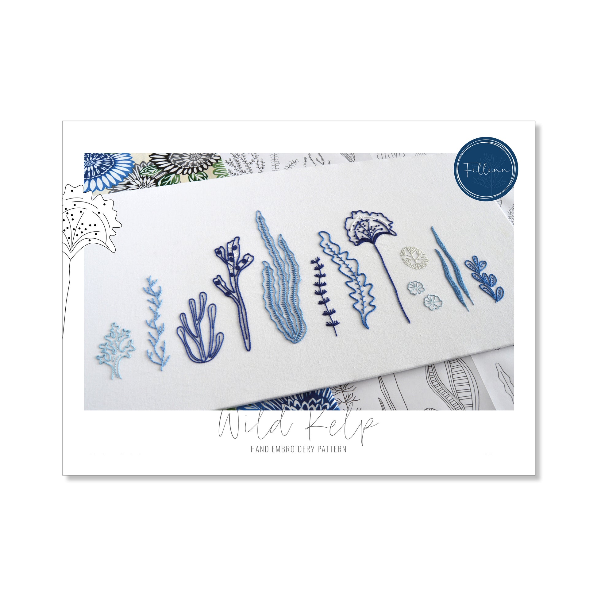 This is a pattern inspired by the kelp forests of the sea. A plethora of stitches create texture and detail in each piece of kelp. And because each one is different, it keeps the embroidery interesting to do. Some are delicate, others bold and substantial. So a nice variety. The arrangement of the design is slightly unusual. It gives the embroidery a contemporary feel. That and the deep and dusty shades of blue.